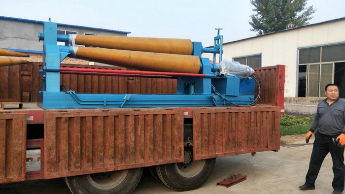 不锈钢铝板专用卷板机,表面挂聚氨酯,可以防止表面有划痕. 该机结构型式为三辊对称式,上辊在两下辊 对称位置作垂直升降运动,通过丝杆丝母蜗杆传动而获得,两下辊作旋转运动,通过减速机的输出齿轮与下辊齿轮啮合,为卷制板材提供扭矩。上辊可分离取料电动升降起辊。可安装靠轮卷制锥体、角铁、槽钢等异异型钢材。